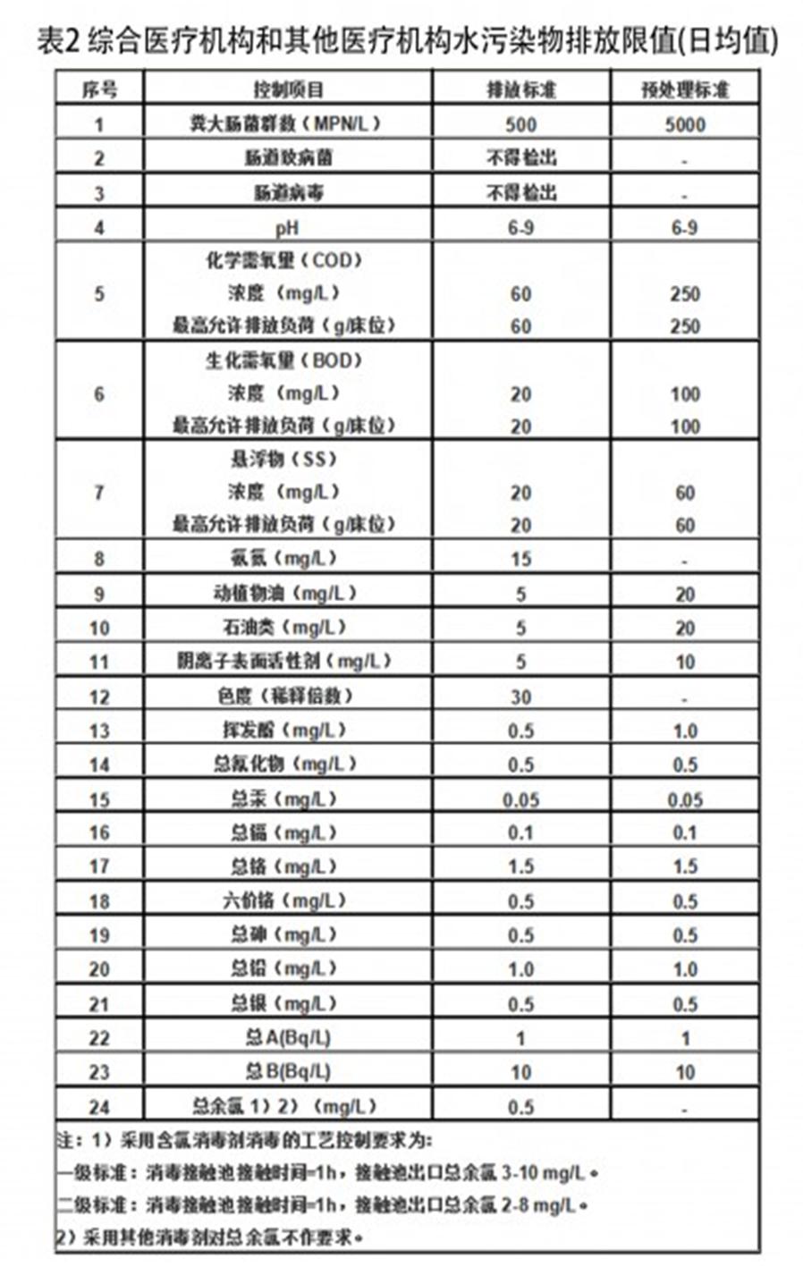 3、縣級及縣級以上或 20 張床位及以上的綜合醫(yī)療機構(gòu)和其他醫(yī)療機構(gòu)污水排放執(zhí)行表 2 的規(guī)定。直接或間接排入地表水體和海域的污水執(zhí)行排放標準,排入終端已建有正常運行城鎮(zhèn)二級污水處理廠的下水道的污水,執(zhí)行預(yù)處理標準。